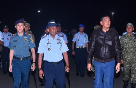 Keterangan : Menteri Pertahanan Republik Indonesia (Menhan RI), Jenderal TNI (Hor) Purn. Sjafrie Sjamsoeddin, sambangi Pangkalan TNI Angkatan Udara (Lanud) Raden Sadjad, Kabupaten Natuna, Kepulauan Riau, Selasa (18/11/2025) malam.