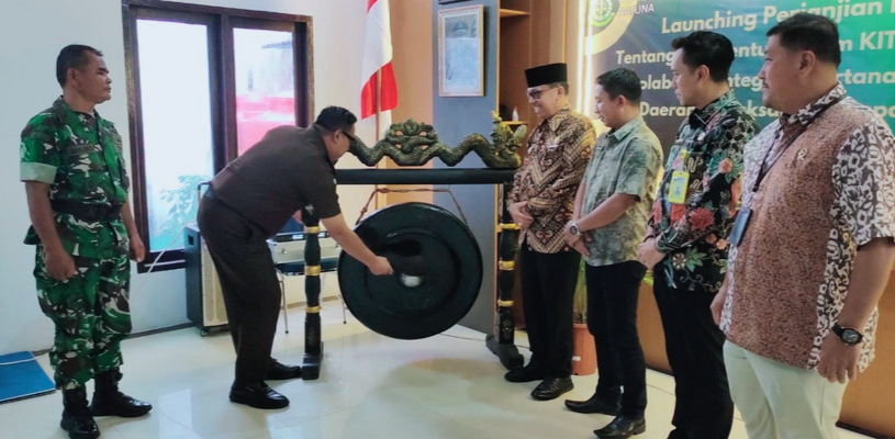Foto : Kajari Natuna Dr. Erwin Indrapraja tampak pemukulan gong ditandai secara resmi launching Perjanjian Kerja Sama (PKS) tentang pembentukan tim KITA PENDEKAR KMP dihadiri Wakil Bupati NatunaJarmin Siddik, SE. Ketua DPRD Kabupaten Natuna Rusdi. Ketua Pengadilan Negeri Natuna, Kepala Kantor Pertanahan Kabupaten Natuna, perwakilan Kapolres Natuna, perwakilan Dandim 0318/Natuna diwakili Komandan Komando Rayon Militer (Danramil) 01 Ranai, Mayor Inf. Roganda Simanjuntak, SE, di Aula Kantor Kejaksaan Natuna, Kamis (19/02/2026).