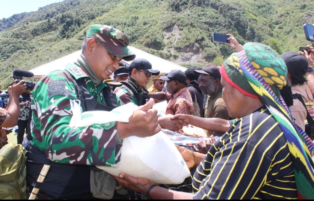 Irian – batamtimes.co – Aparat gabungan TNI dan Polri mengamankan kunjungan Bupati Puncak Jaya Elvis Tabuni untuk memberikan bantuan sembako, santunan duka, serta kebutuhan lainnya ke warga Kampung Kembru, Distrik Sinak, yang menjadi korban aksi Kekerasan Kelompok Bersenjata (KKB pada 14 April lalu.